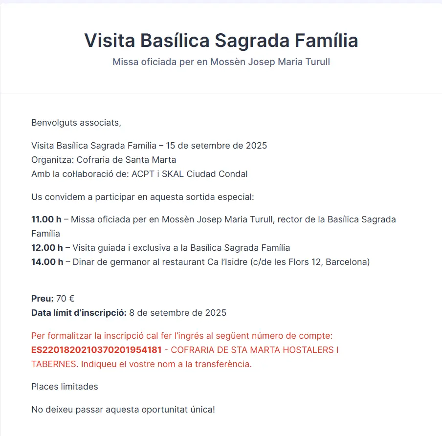 la Cofraria de Santa Marta, amb la col·laboració de l’ACPT i SKAL Ciudad Condal, organitza una visita molt especial a la Basílica de la Sagrada Família.